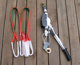 ウインチ(1t用)とナイロンスリングで引っ張ってみました。正直1t用は大袈裟だったようです。 トラックで使う荷締機でも十分だったようです。